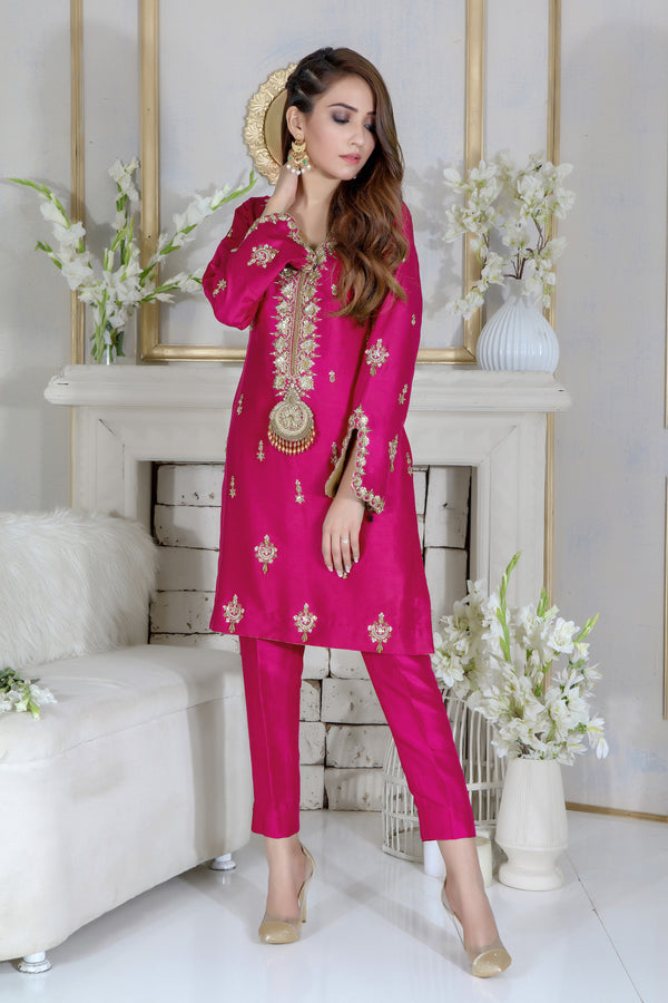 Hot Pink Embroidered Raw Silk 3-Piece Suit