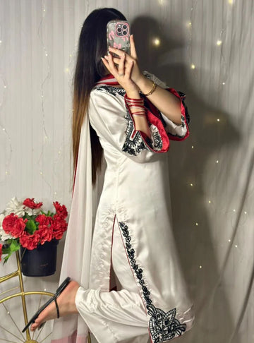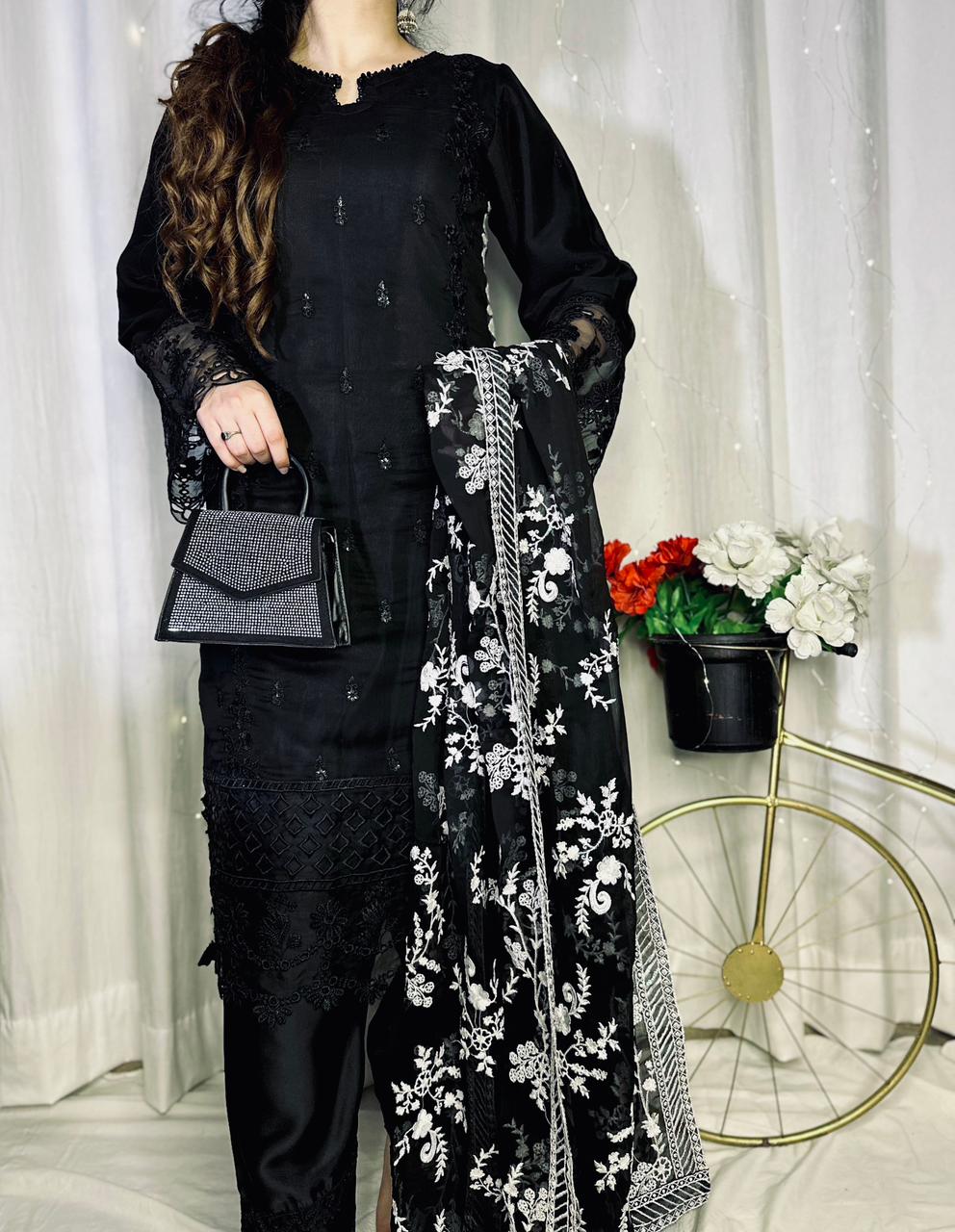 Luxury Black Mirror Silk Dress with Hand Embroidery – Medium Size | Pre-Booking Available
