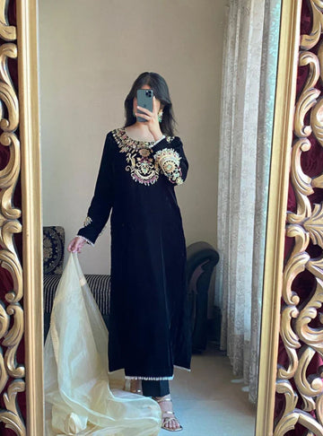 Exquisite Black Georgette Embroidered Suit with Moti Work & Heavy Floral Dupatta