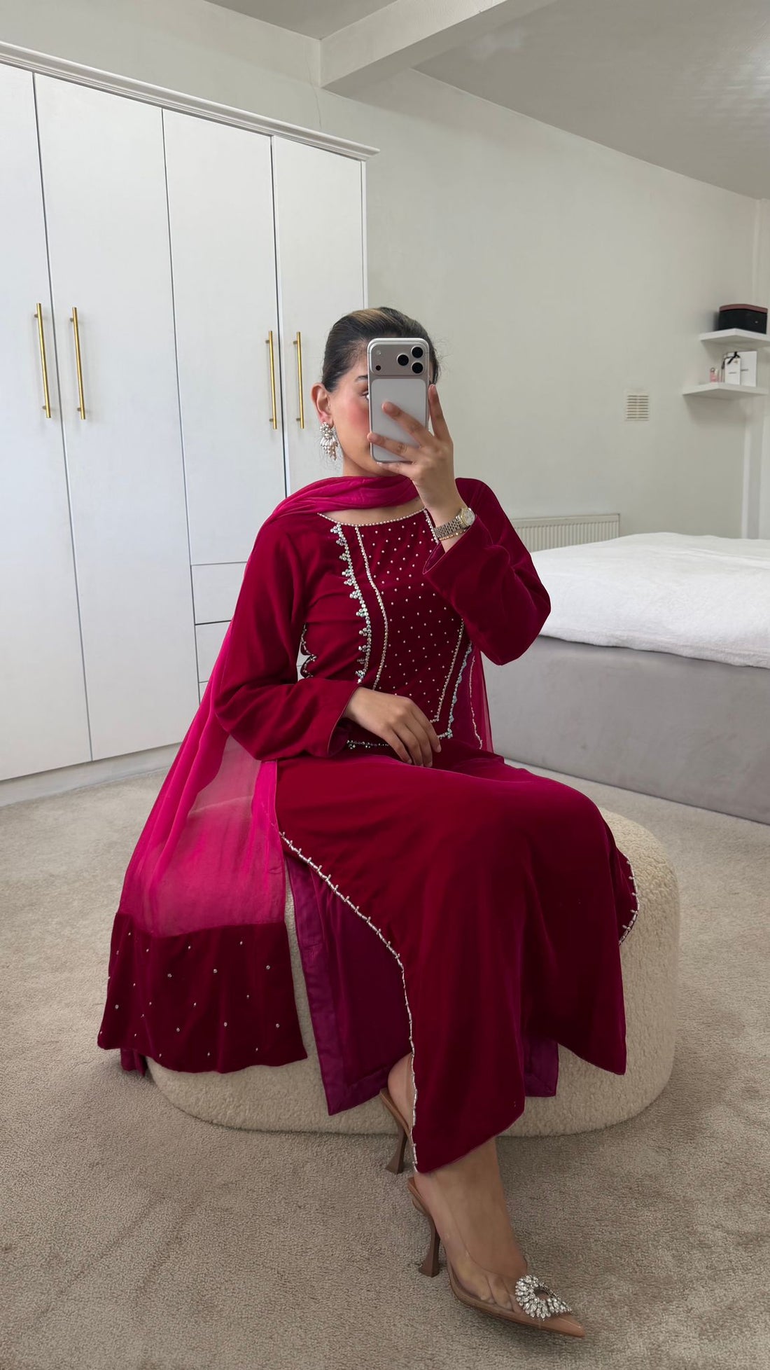 Deep Maroon Pearl-Embellished Velvet Suit | 3-Piece Luxury Festive Set