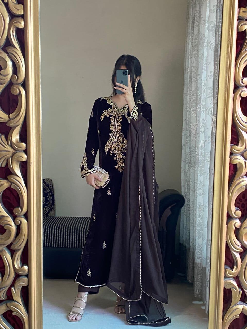 Luxury Brown Velvet Suit with Gold Zari Embroidery & Chiffon Dupatta