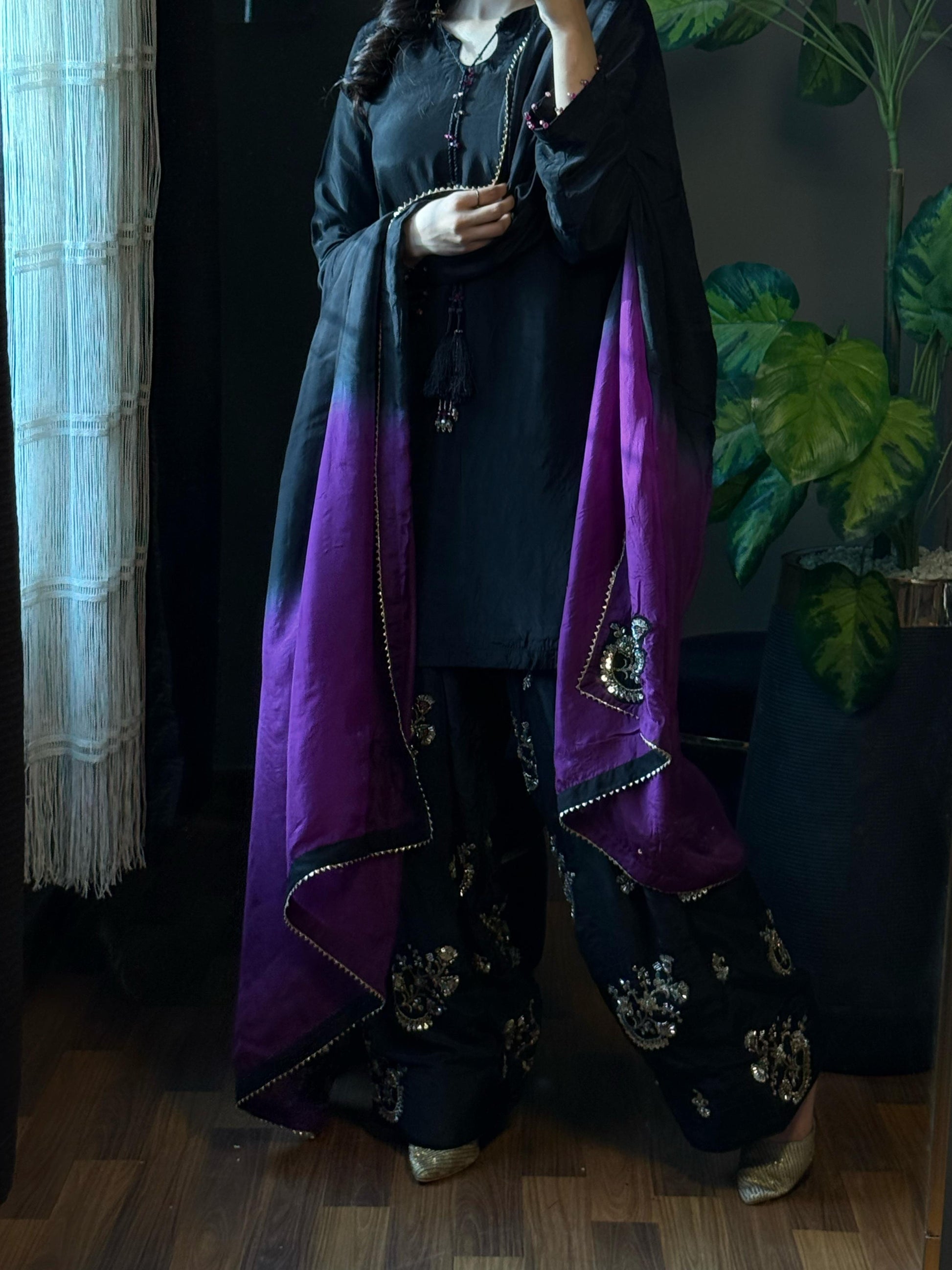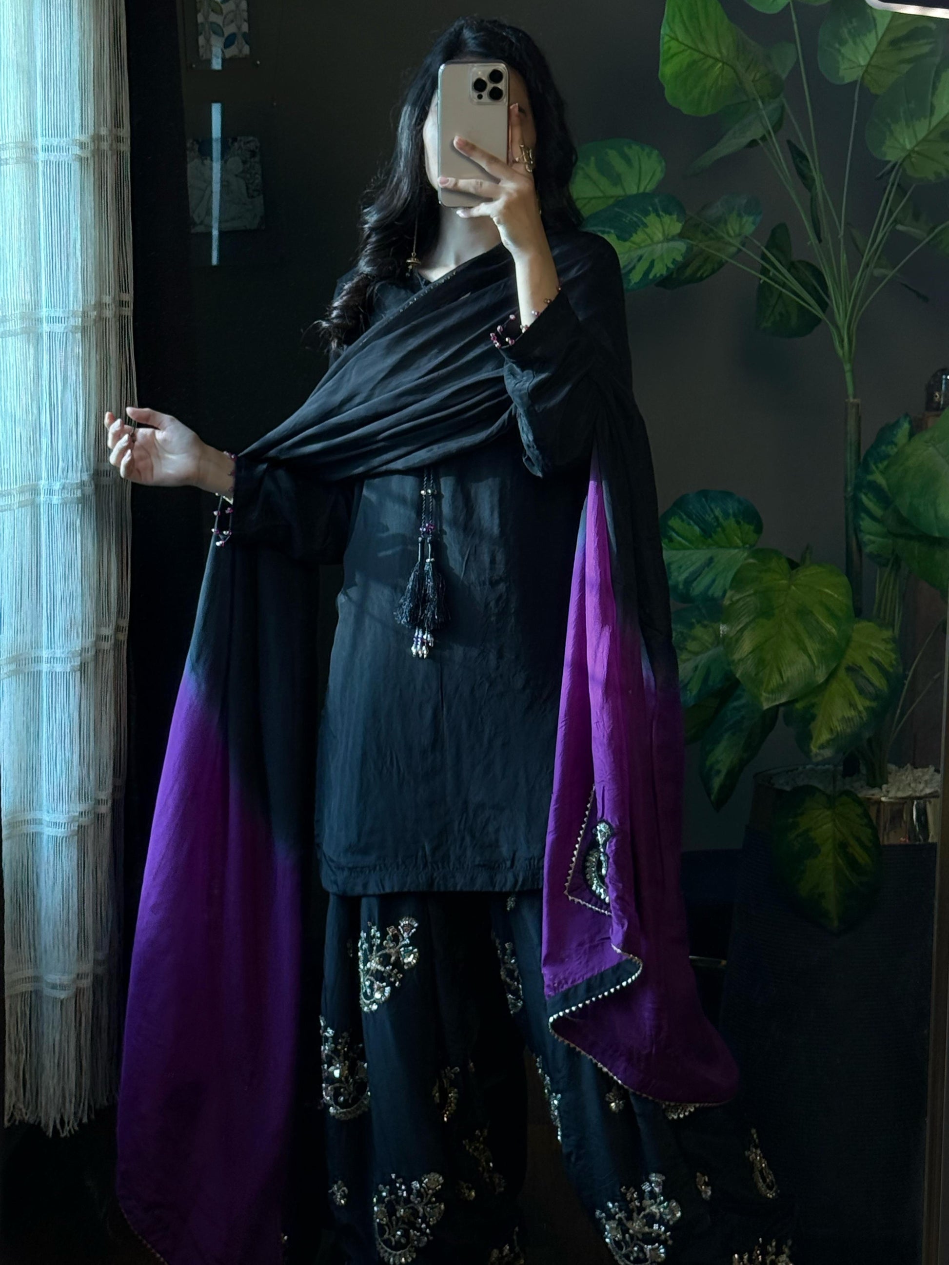 Color Palette: Classic Black with a Striking Purple Ombre Dupatta