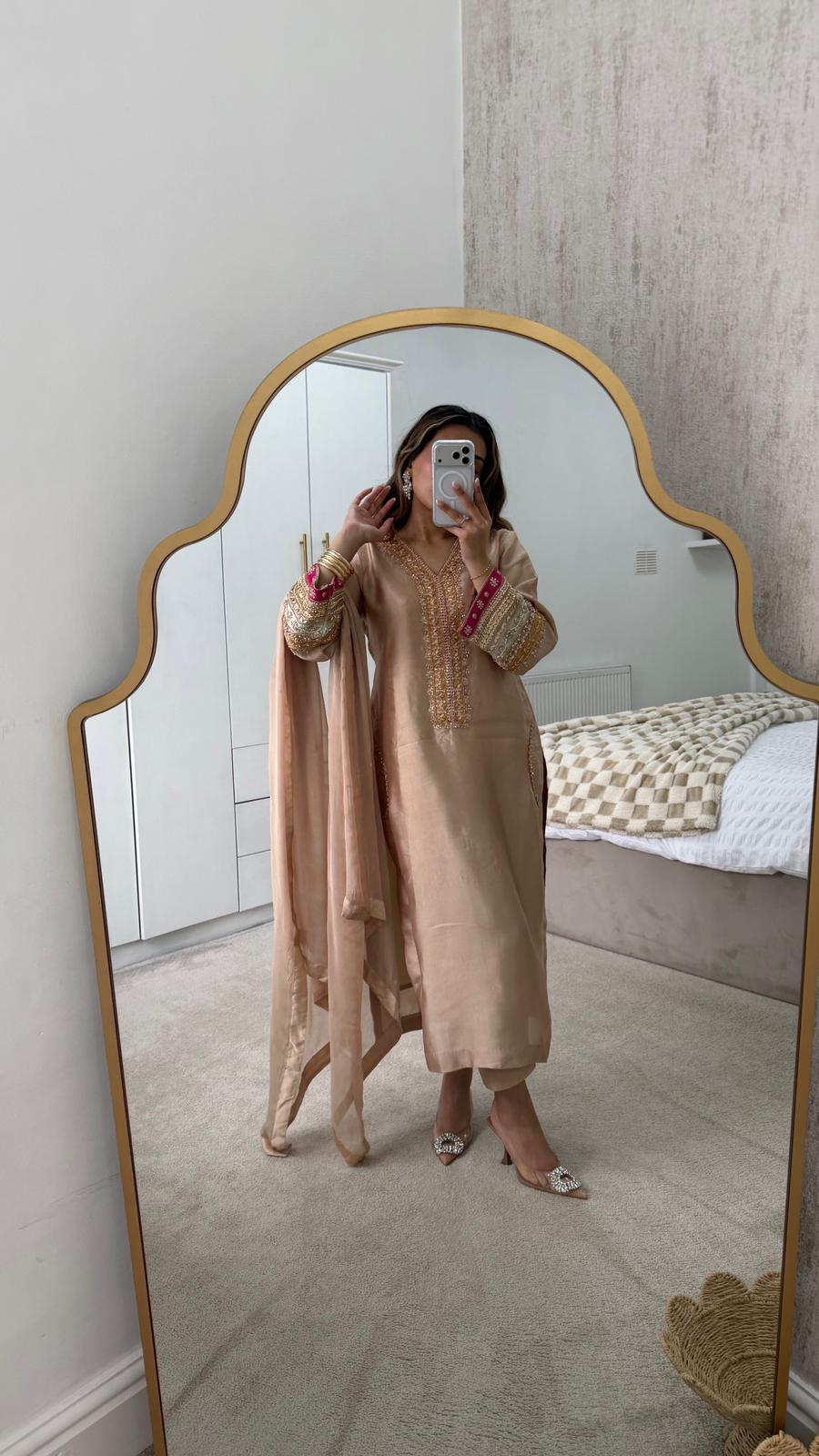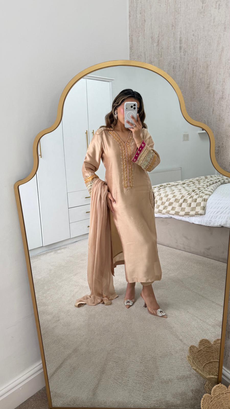 This 3-piece suit includes a beautifully designed qameez, coordinating trousers, and a graceful dupatta, making it a complete party-ready outfit. Weighing approximately 2 kg, it feels substantial yet comfortable. Perfect for weddings, formal gatherings, or any celebration where you want to make a lasting impression.