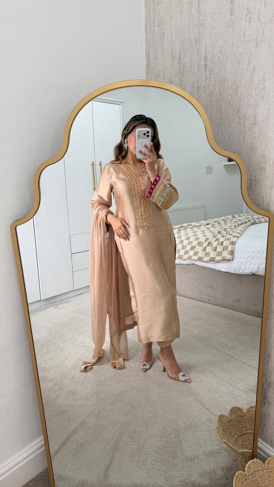 Elegant Light Golden Silk 3-Piece Party Wear Suit with Embellishments