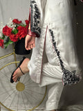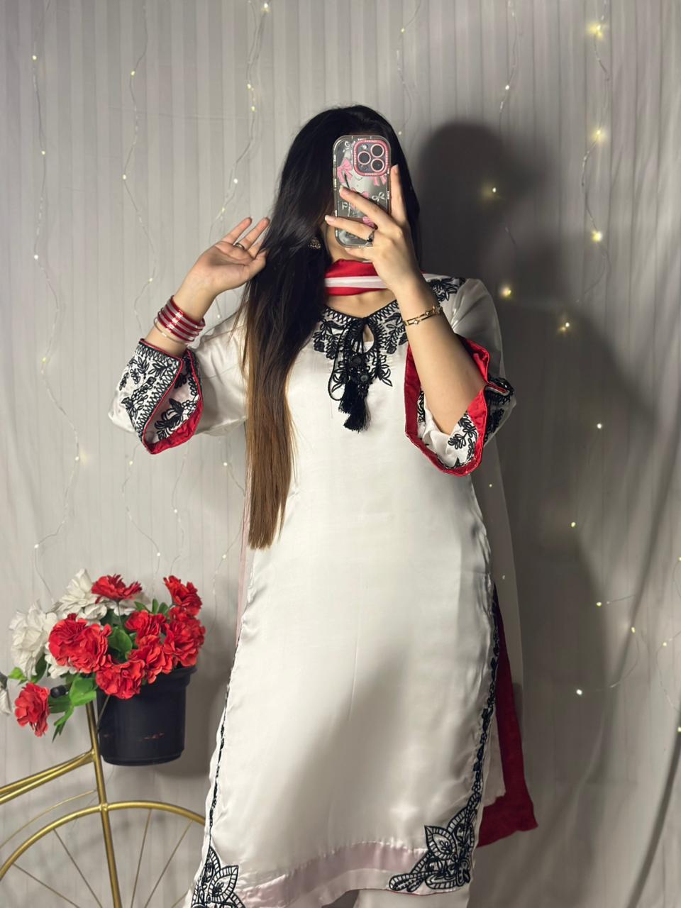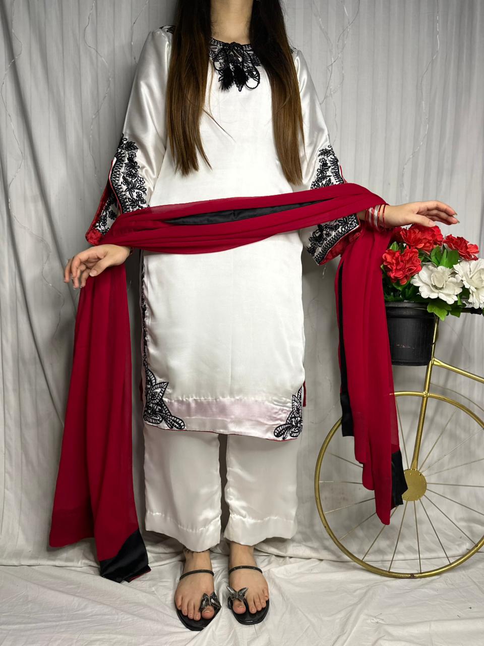 Elevate your wardrobe with this exquisite 3-piece formal suit, crafted from premium silk for a smooth and luxurious finish. Featuring intricate black machine embroidery on a pure white base, this outfit exudes timeless elegance. The set includes an embroidered kurta, matching silk trousers, and a contrasting red dupatta with black finishing—perfect for weddings, parties, and festive occasions.