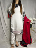 Elegant White Silk 3-Piece Suit with Black Embroidery & Red Dupatta