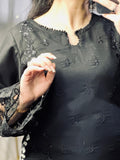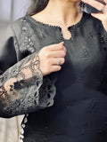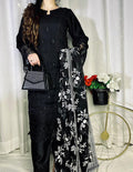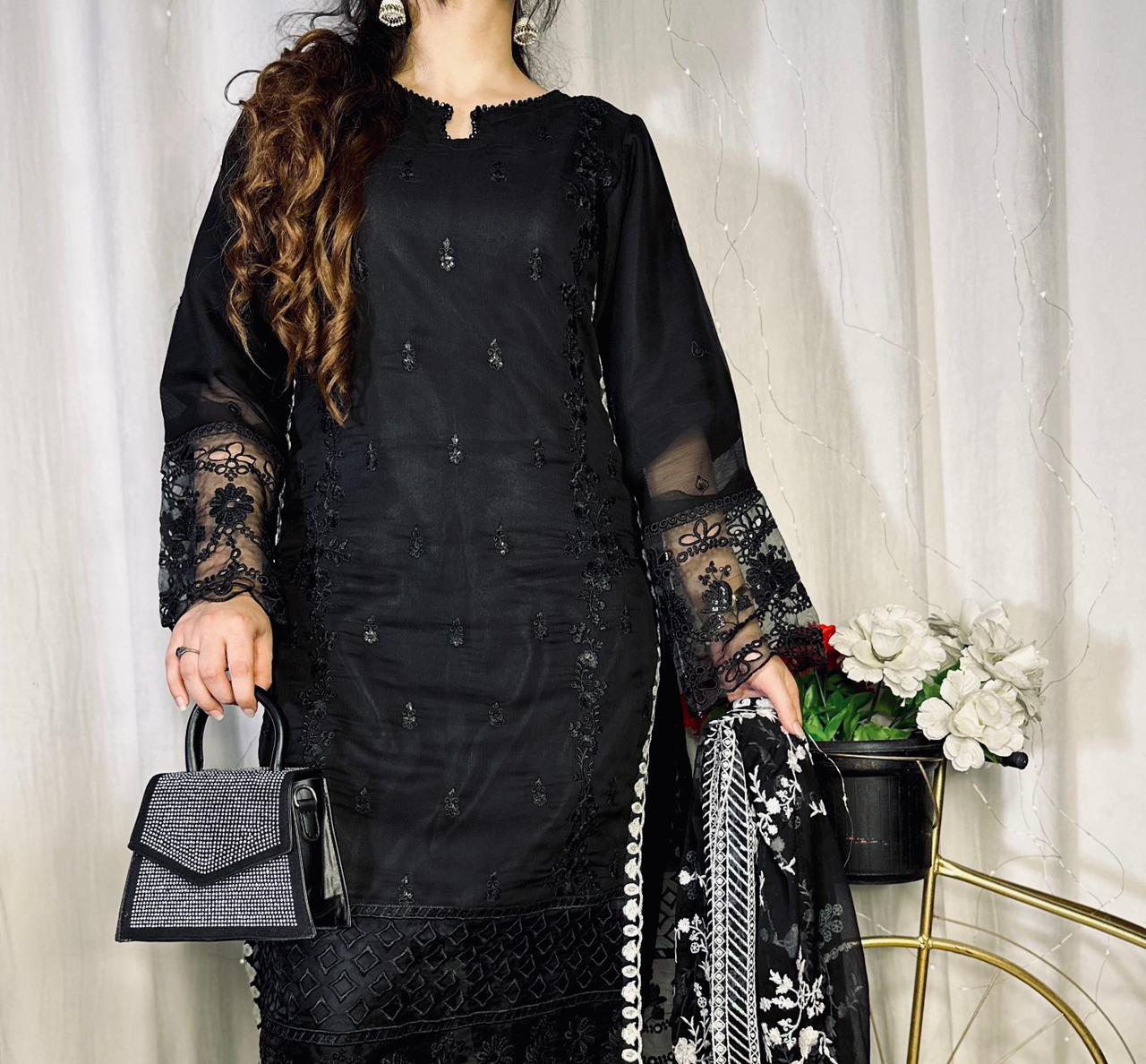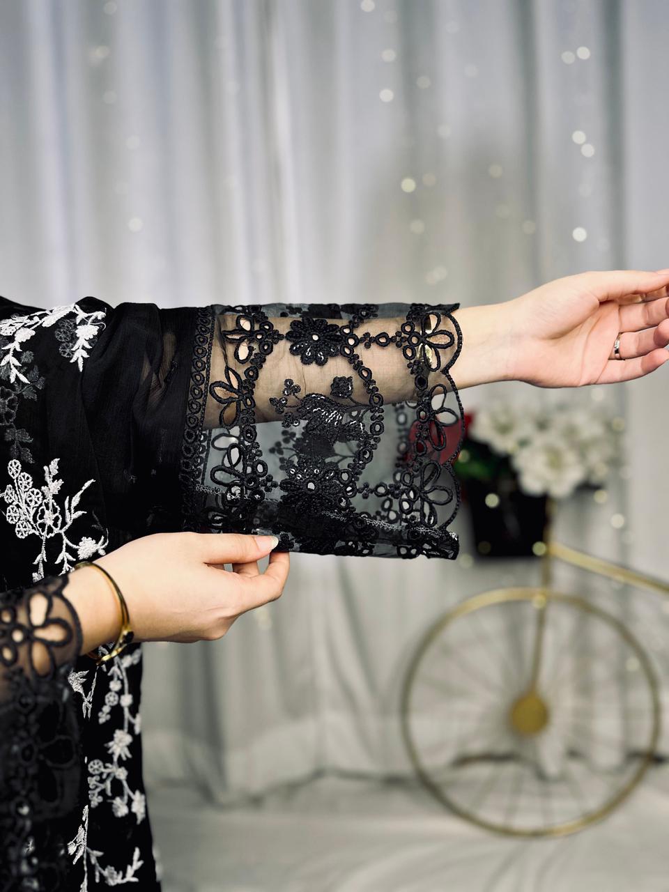 Dupatta: The centerpiece of this outfit—a Heavy Blooming Georgette Dupatta adorned with striking white floral embroidery and detailed borders that contrast beautifully against the deep black base.