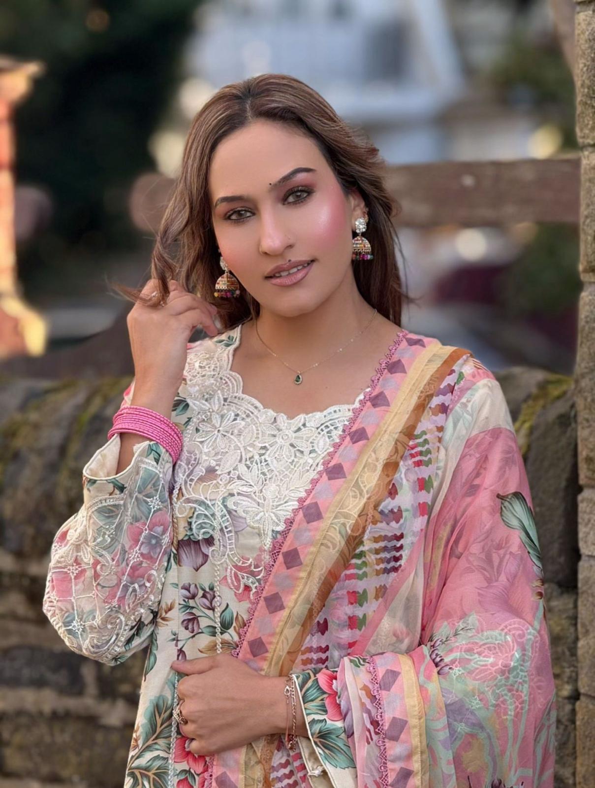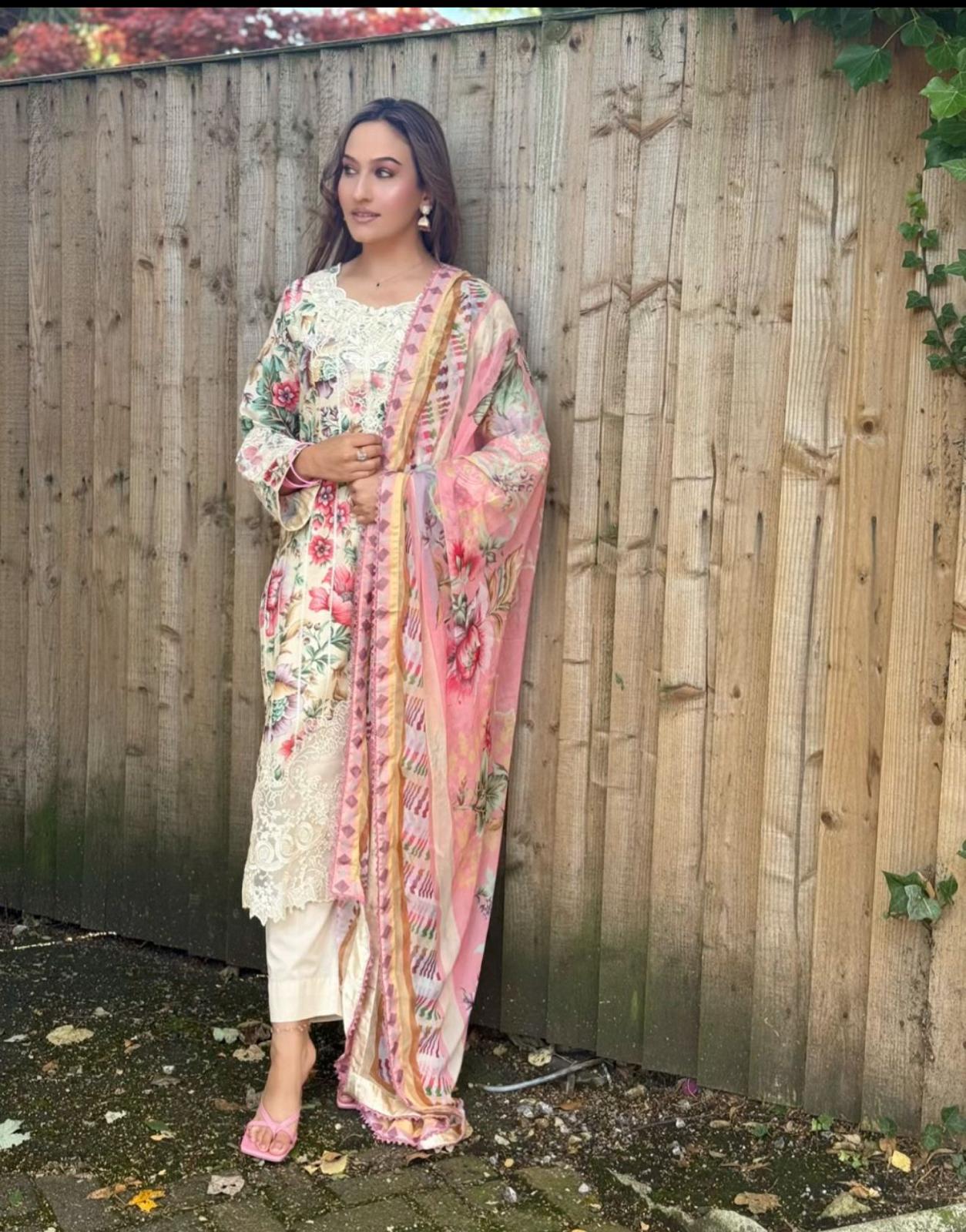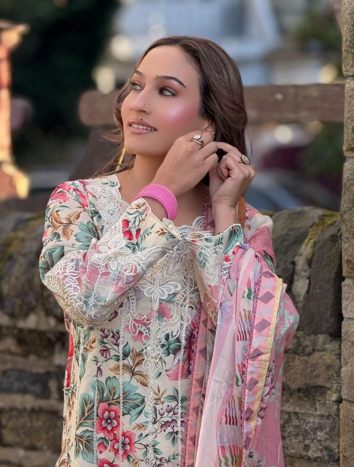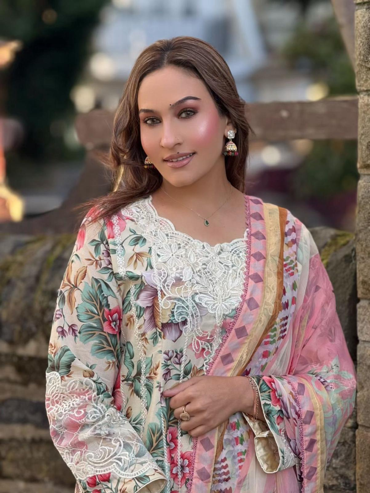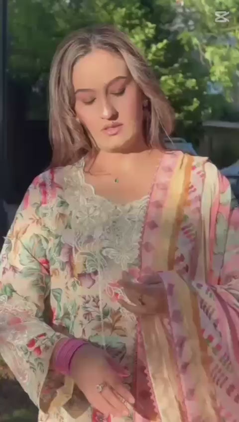 Elevate your everyday look with this beautifully designed soft cotton embroidered suit. The outfit features a cream base adorned with vibrant floral prints, delicate lacework, and a flowy chiffon dupatta in pastel shades. Perfect for casual wear, this outfit blends comfort with elegance.
